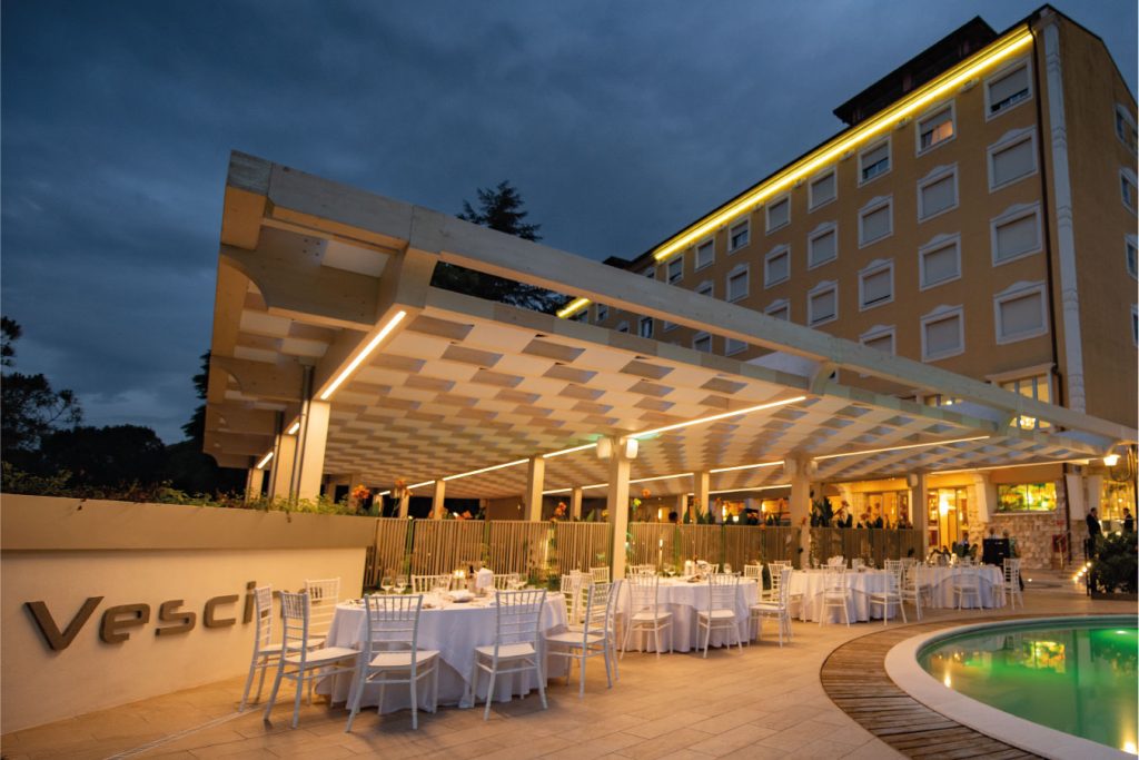 Disponiamo di ampi spazi interni ed esterni, perfetti per qualsiasi tipologia di evento. All’esterno, potrai godere di un parco secolare di 31.000 mq, prati e giardini floreali, due dehors con l’esclusiva Terrazza Aqua e due piscine termali. La scenografia unica che possiamo creare, sia diurna che notturna, renderà il tuo evento davvero incantevole. All’interno, troverai tre sale, ognuna con una sua caratteristica, un moderno ed accogliente salone e un American Bar, tutti curati sia a livello estetico che culinario.